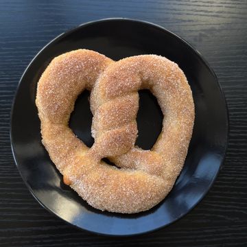 Braided bread topped with sugar (pictured is our chocolate Trenzado)