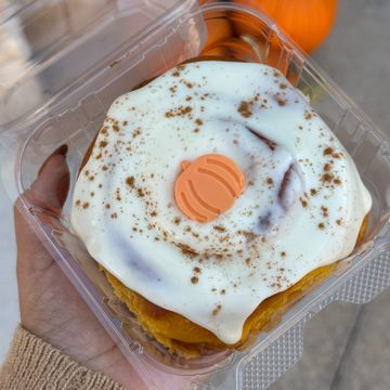 cinnamon roll with a pumpkin flavored dough, cinnamon, and a cream cheese icing. Topped with pumpkin spice